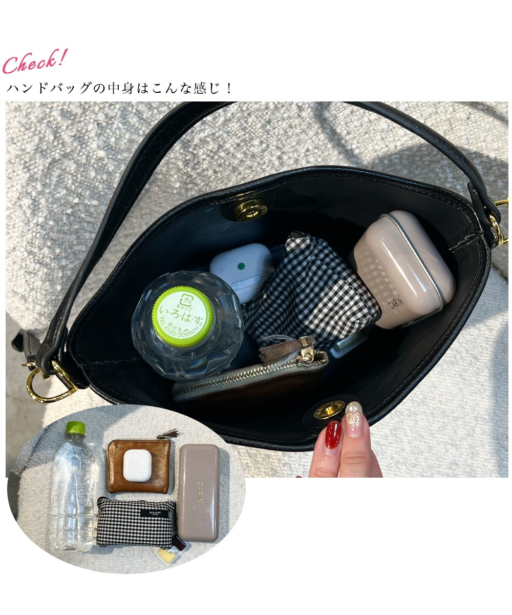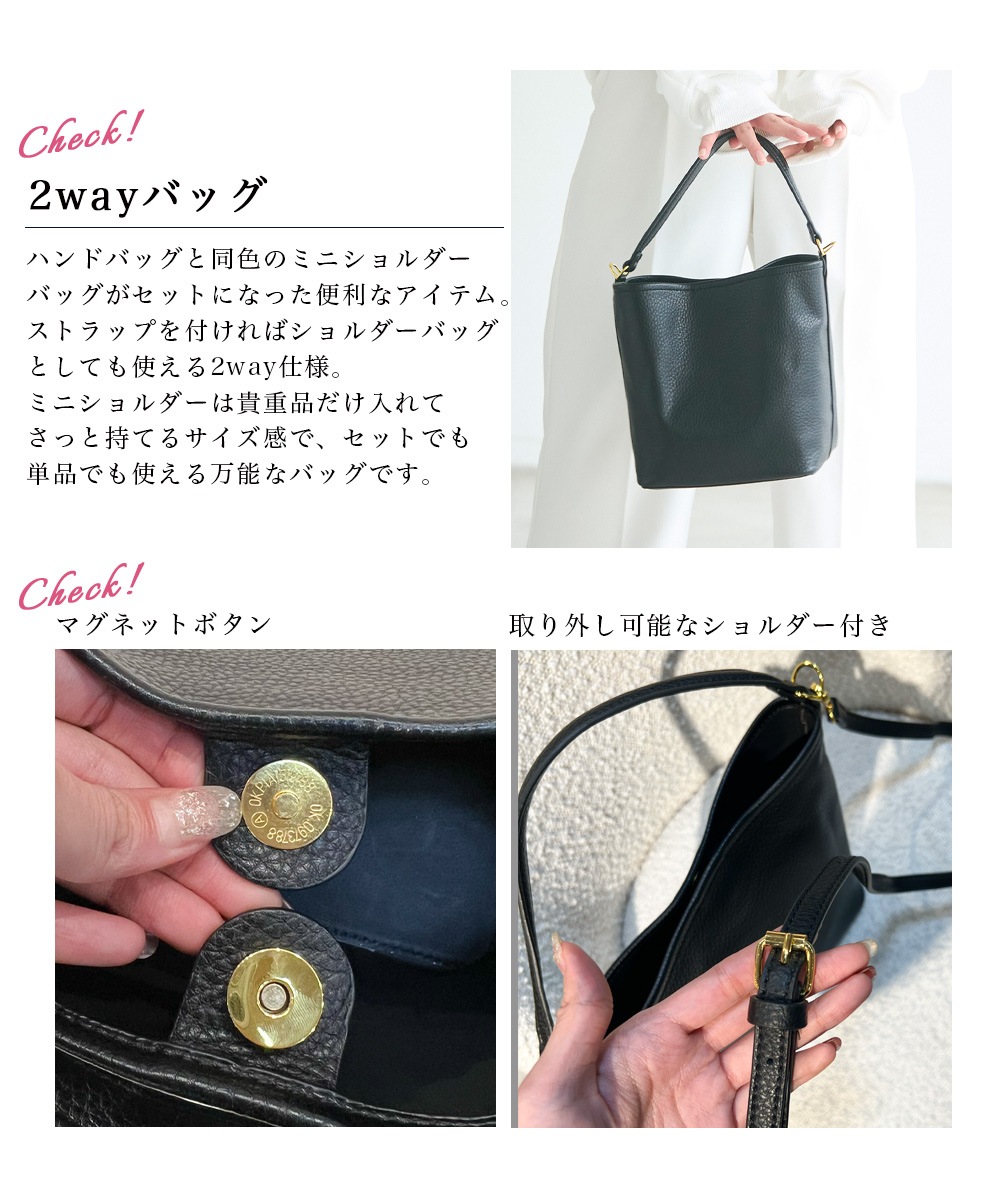| サイズ | 【バケツバッグ】:高さ 約20cm/底横幅 約17.5cm/入口幅 約26cm/奥行き 約12cm/ハンドル 約33cm/ショルダー 約92~108cm,【ミニポシェット】:高さ 約14cm/底横幅 約15cm/入口幅 約17cm/奥行き 約7.5cm/ショルダー 約119cm |