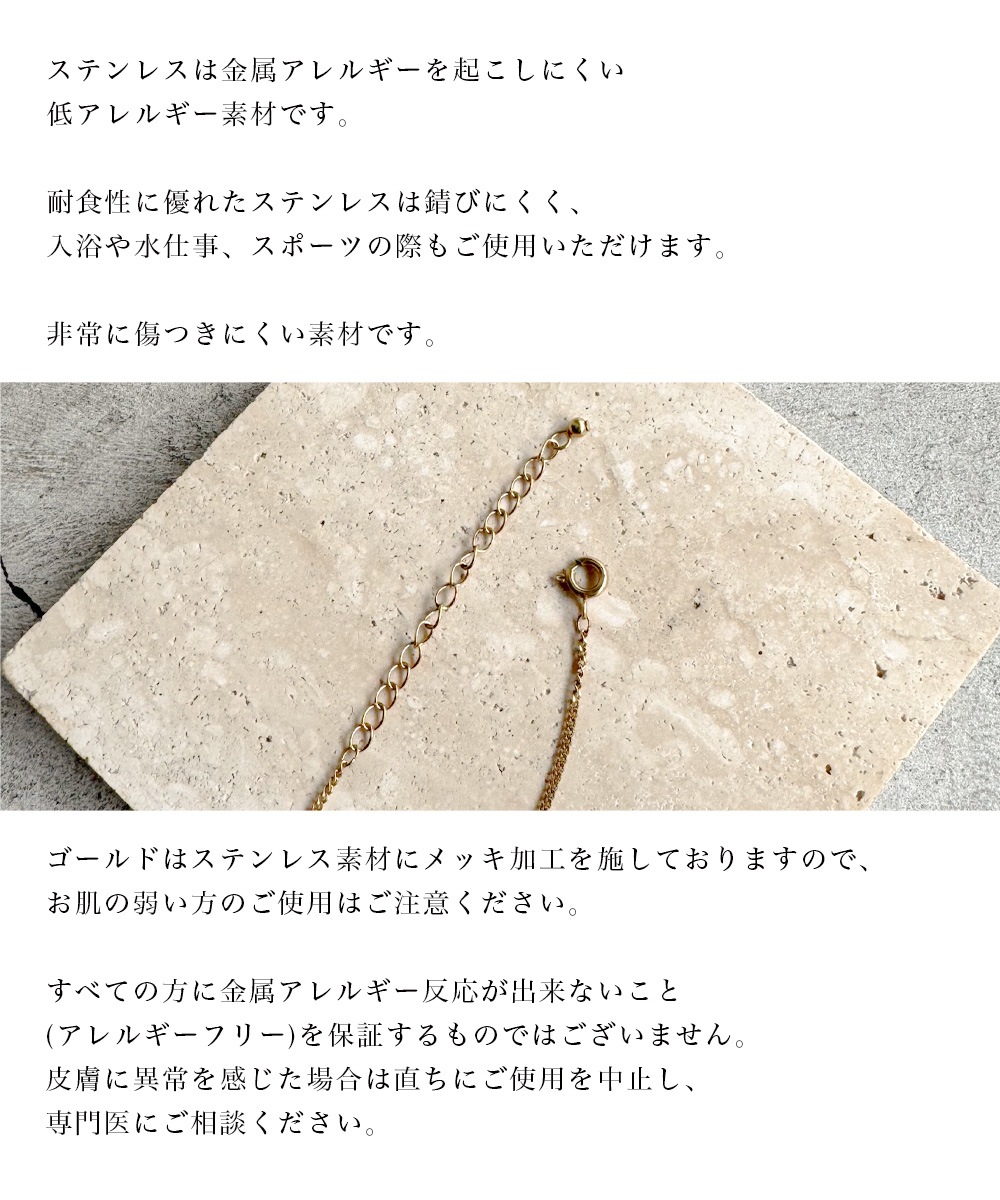 ※完全なアレルギーフリーではございませんので、ご注意ください。 ※研磨剤の入ったクロスは劣化の原因となりますので避けて頂き、眼鏡拭きやセーム革など、柔らかい布で優しくお手入れください。 ※パソコンモニターまたは撮影ライトや自然光での光の影響により、画像によって実際の商品の素材感や色の差を感じることがございます。 ※生産時期が異なる場合、多少の色味や仕様が変わる場合がございますのであらかじめご了承ください。 ※使用後や汚れた際は、柔らかく乾いた布で拭いて下さい。 ※すべての方に金属アレルギー反応が出来ないこと(アレルギーフリー)を保証するものではございません。 皮膚に異常を感じた場合は直ちにご使用を中止し、専門医にご相談ください。 ※メッキ加工を施している商品につきましては、汗や摩擦、化粧品と触れたり、着用したまま入浴することで、剥がれ落ちやすくなります。ご了承の上お買い求め下さい。 |