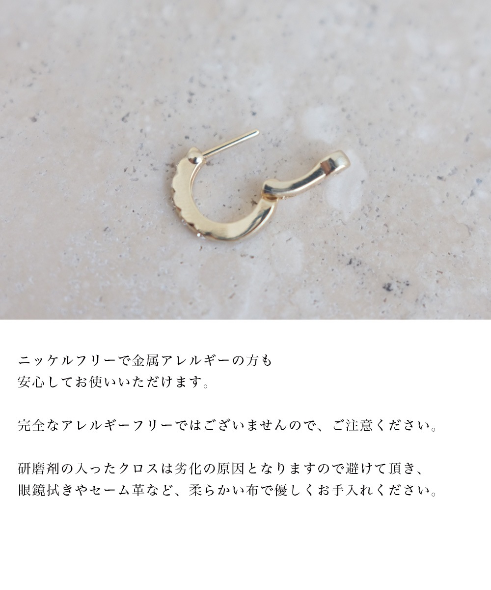 ※完全なアレルギーフリーではございませんので、ご注意ください。 ※研磨剤の入ったクロスは劣化の原因となりますので避けて頂き、眼鏡拭きやセーム革など、柔らかい布で優しくお手入れください。 ※パソコンモニターまたは撮影ライトや自然光での光の影響により、画像によって実際の商品の素材感や色の差を感じることがございます。 ※生産時期が異なる場合、多少の色味や仕様が変わる場合がございますのであらかじめご了承ください。 ※使用後や汚れた際は、柔らかく乾いた布で拭いて下さい。 ※すべての方に金属アレルギー反応が出来ないこと(アレルギーフリー)を保証するものではございません。 皮膚に異常を感じた場合は直ちにご使用を中止し、専門医にご相談ください。 ※メッキ加工を施している商品につきましては、汗や摩擦、化粧品と触れたり、着用したまま入浴することで、剥がれ落ちやすくなります。ご了承の上お買い求め下さい。 |