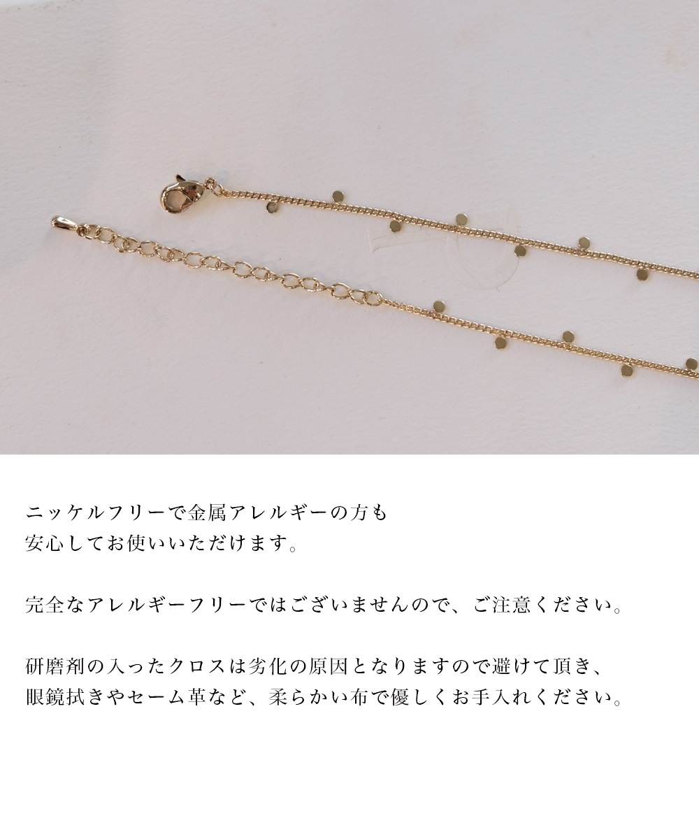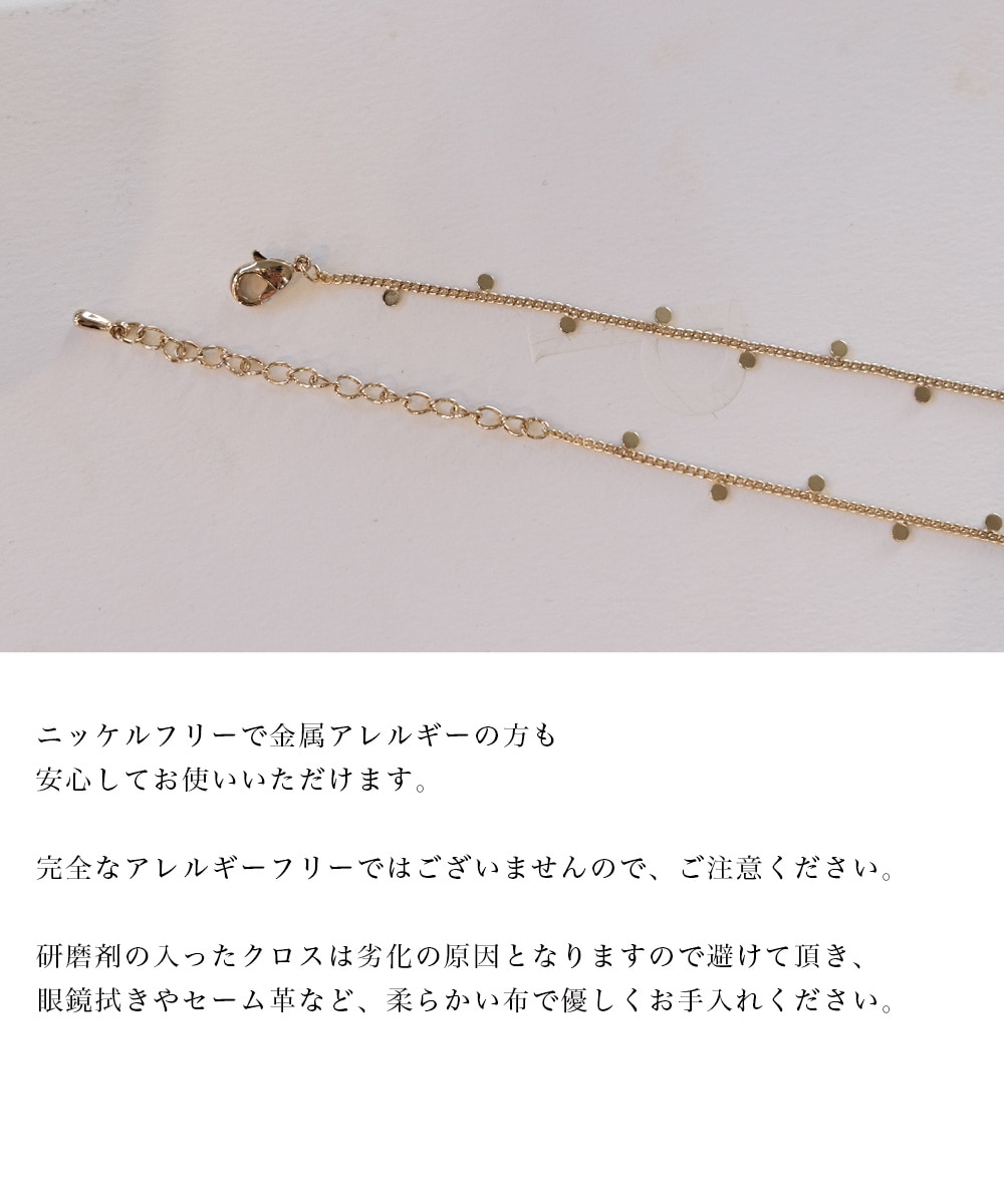 ※完全なアレルギーフリーではございませんので、ご注意ください。 ※研磨剤の入ったクロスは劣化の原因となりますので避けて頂き、眼鏡拭きやセーム革など、柔らかい布で優しくお手入れください。 ※パソコンモニターまたは撮影ライトや自然光での光の影響により、画像によって実際の商品の素材感や色の差を感じることがございます。 ※生産時期が異なる場合、多少の色味や仕様が変わる場合がございますのであらかじめご了承ください。 ※使用後や汚れた際は、柔らかく乾いた布で拭いて下さい。 ※すべての方に金属アレルギー反応が出来ないこと(アレルギーフリー)を保証するものではございません。 皮膚に異常を感じた場合は直ちにご使用を中止し、専門医にご相談ください。 ※メッキ加工を施している商品につきましては、汗や摩擦、化粧品と触れたり、着用したまま入浴することで、剥がれ落ちやすくなります。ご了承の上お買い求め下さい。 |