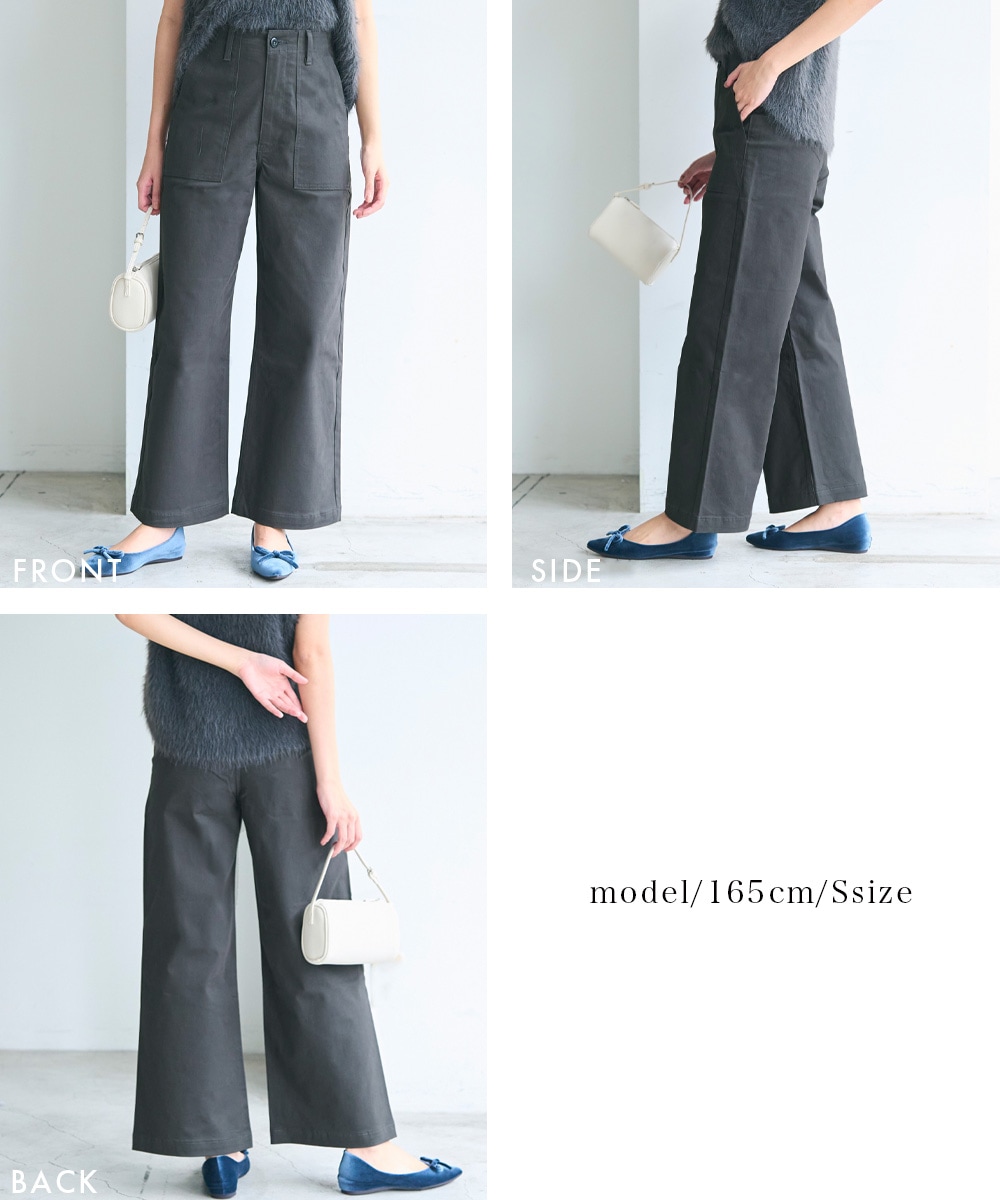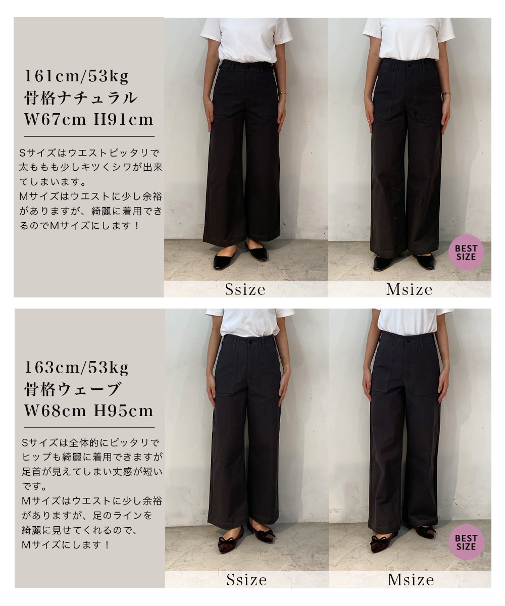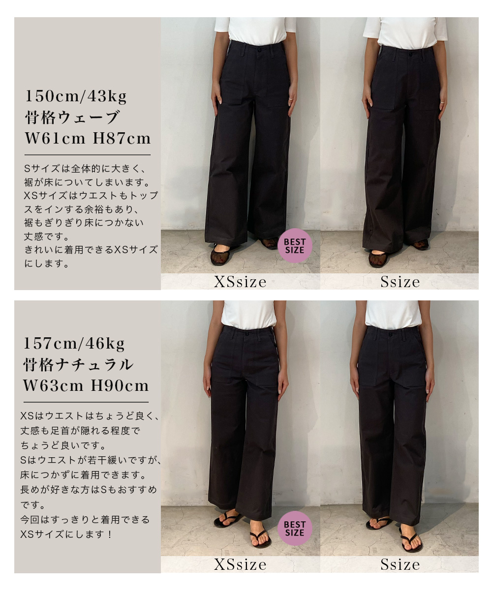 【XS】:脇丈 約97cm/ウエスト 約65cm/前股上 約26cm/後股上 約37cm/股下 約67cm/太もも(一周) 約61cm/裾幅 約28cm/ヒップ 約92cm 【S】:脇丈 約99cm/ウエスト 約67cm/前股上 約26cm/後股上 約37cm/股下 約69cm/太もも(一周) 約63cm/裾幅 約28cm/ヒップ 約94cm 【M】:脇丈 100.5cm/ウエスト 約70cm/前股上 約26cm/後股上 約37cm/股下 約70.5cm/太もも(一周) 約65cm/裾幅 約28cm/ヒップ 約97cm ![]() |