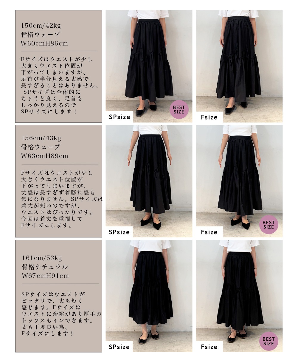 | サイズ | 【SP】:脇丈 約84cm/ウエスト 約54~76cm/ヒップ 約89cm/裾幅 約241.5cm/裏地丈 約71cm 【F】:脇丈 約88cm/ウエスト 約59~81cm/ヒップ 約93cm/裾幅 約249cm/裏地丈 約75cm ![]() |
